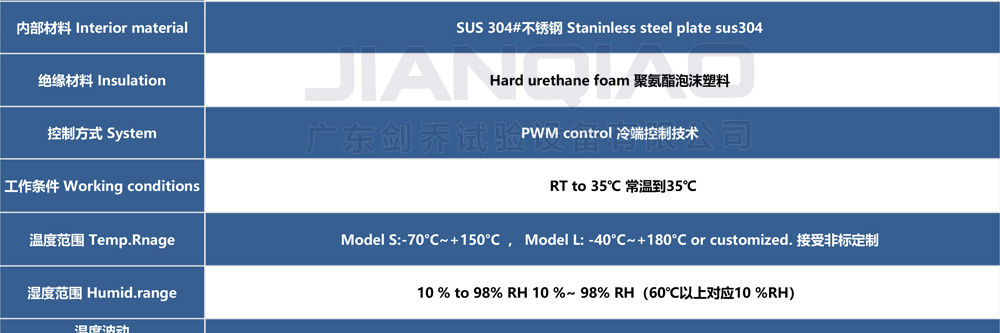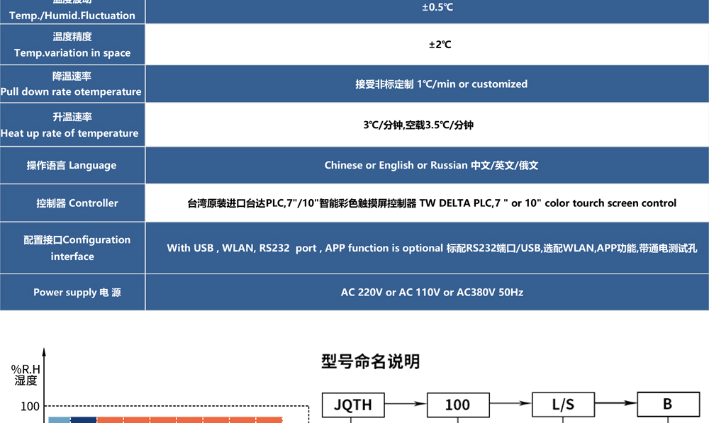 用途:可程式恒溫恒濕試驗箱 JQTH-1200L(屬于:雙開門非標定制款)主要用來測試各種材料耐熱、耐寒、耐干、耐濕的性能。本機采用智能中英俄文顯示7寸彩色觸控式屏幕畫面,操作簡單,程序編輯